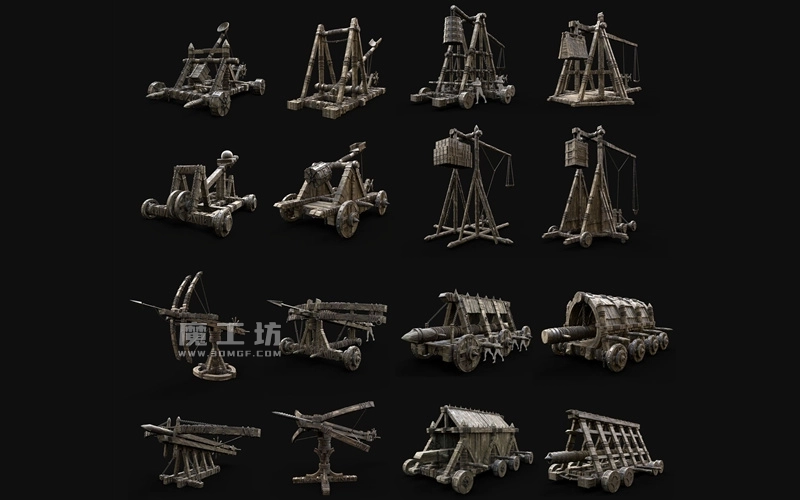 中世纪攻城武器战争机械3D模型投石机弩炮弹射器攻城槌带4K纹理