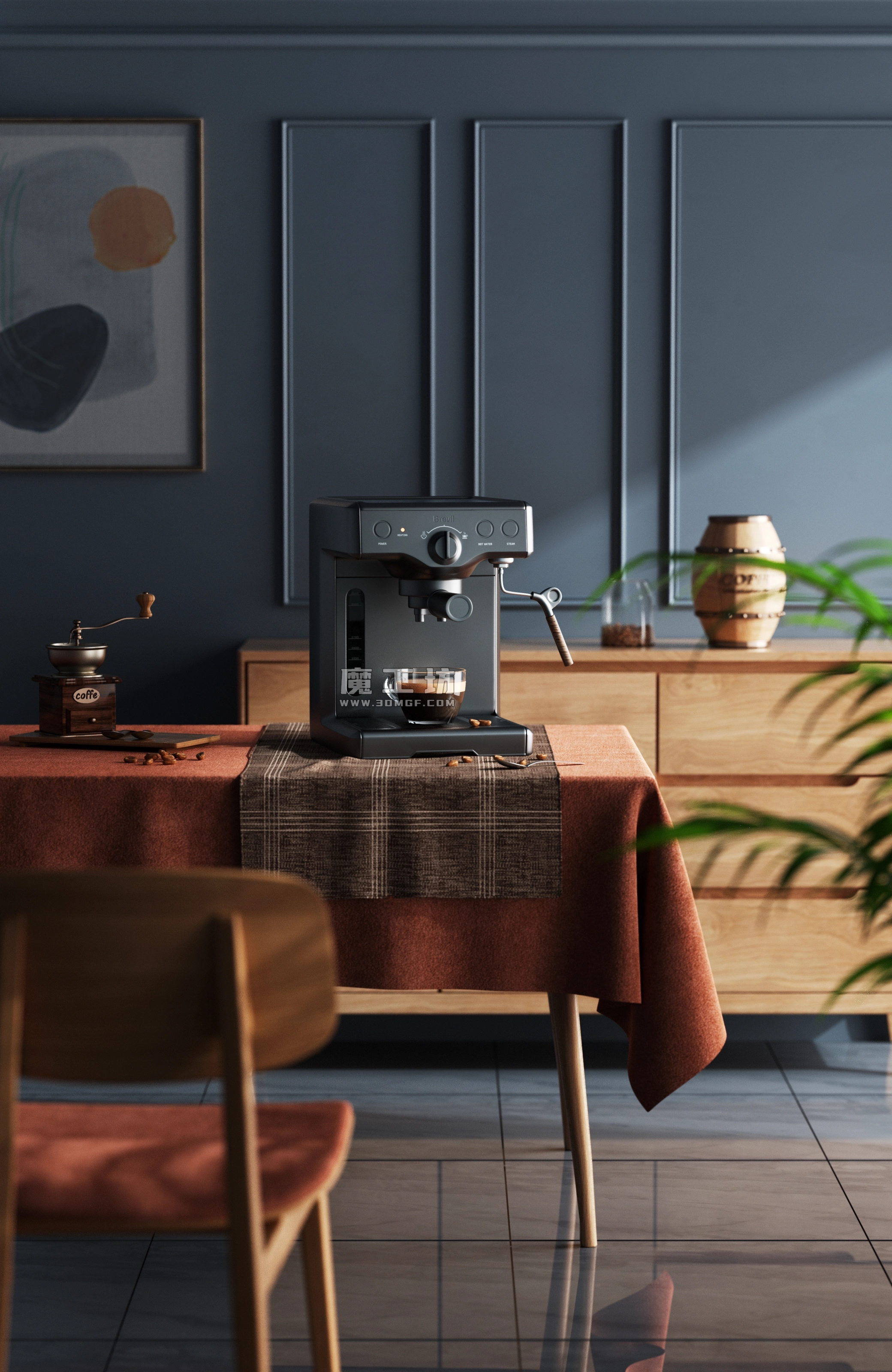魔工坊 OCtane工程 深灰色咖啡机与桌椅绿植室内场景模型工程 https://3dmgf.com/13395.html