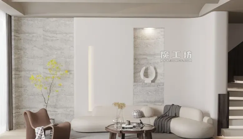 魔工坊-RS工程-弧形沙发茶几与客厅单人椅楼梯场景模型工程