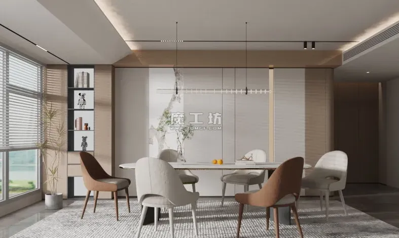 魔工坊-RS工程-椭圆餐桌餐椅与餐厅吊灯置物架场景模型工程