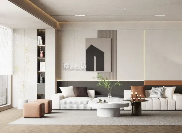 魔工坊-RS工程-沙发茶几脚凳与客厅书架绿植场景模型工程