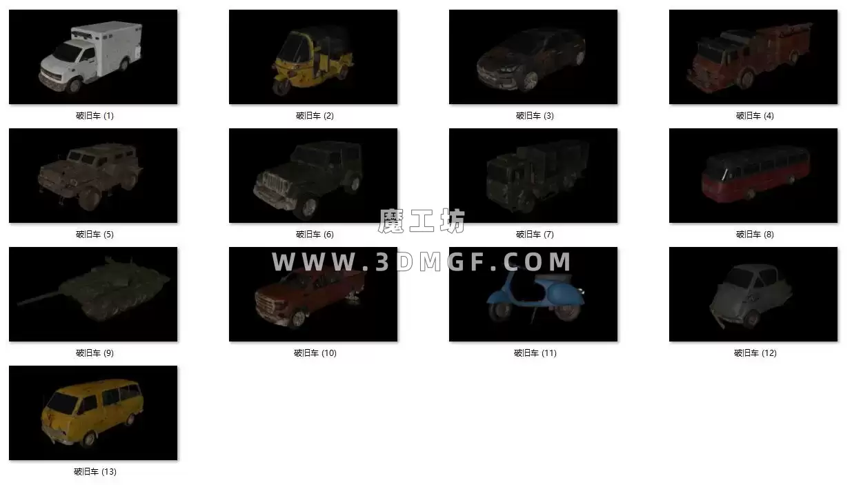 魔工坊 交通/车船/飞机 魔工坊-13个破旧汽车坦克摩托车货车模型C4D模型含贴图 https://3dmgf.com/2364.html