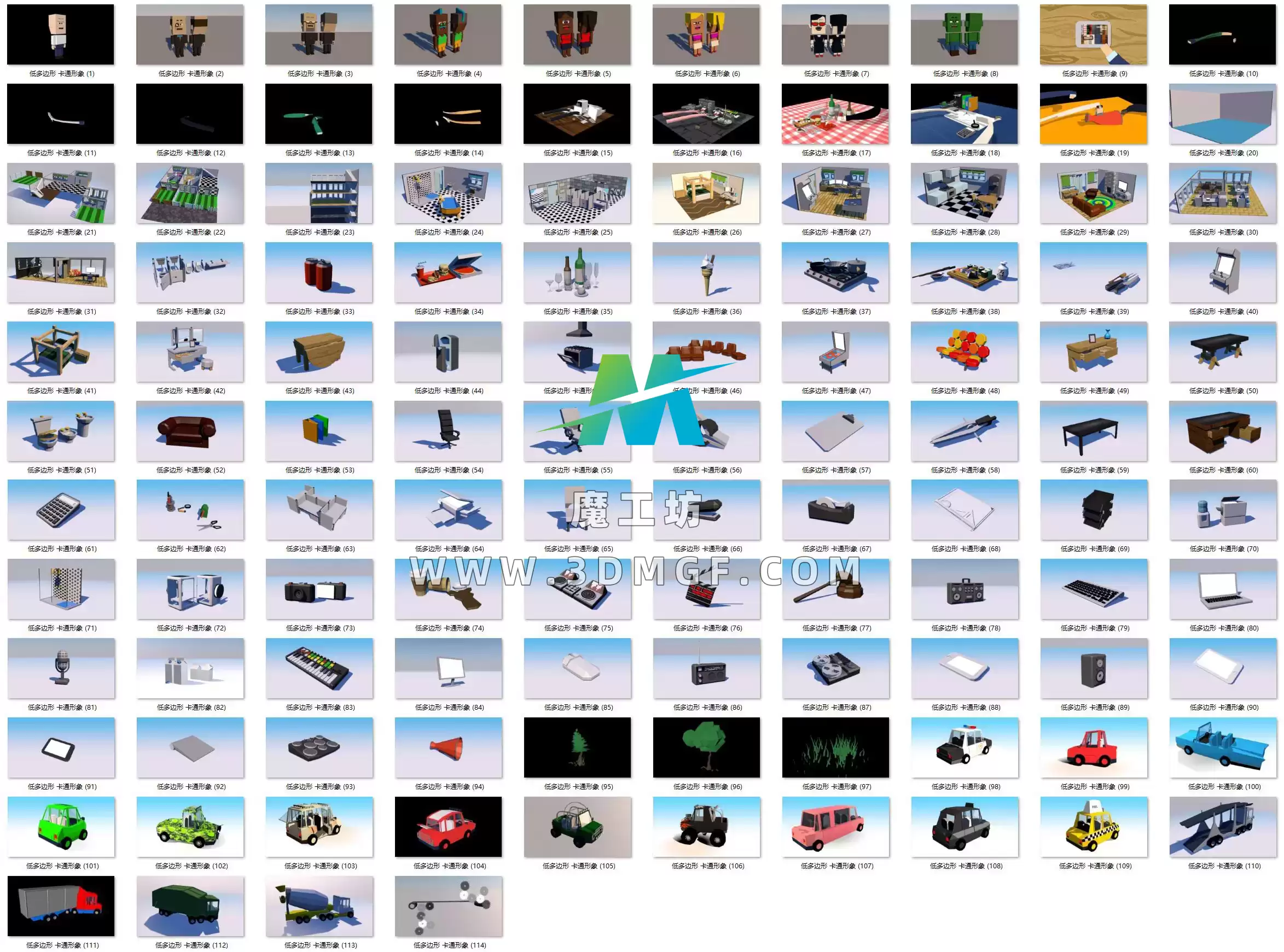 魔工坊 人物/动物/食物 魔工坊-114个低多边形卡通人物室内家居汽车 https://3dmgf.com/3348.html