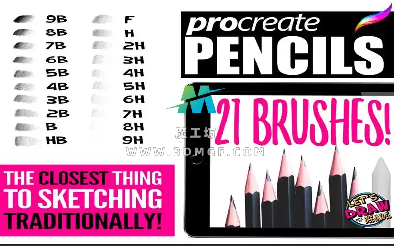 包含 21 支 Procreate 画笔: 20 支 9B-9H 号铅笔画笔,1 支混合笔杆(用作晕染刷)