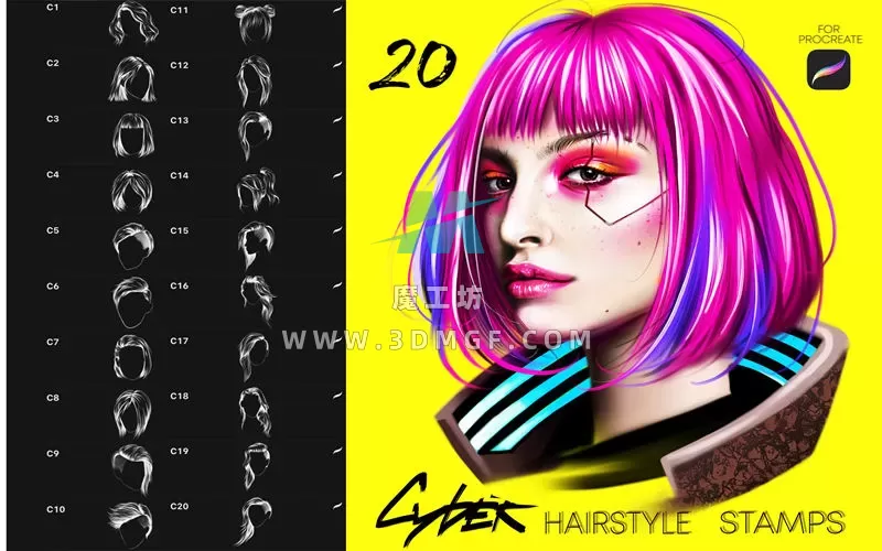 这是我的20 款 CyberPunk 发型 Procreate 画笔套装 ,可帮助您进行肖像画
