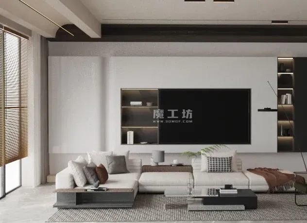 魔工坊-RS工程-电视沙发茶几与客厅置物架楼梯场景模型工程